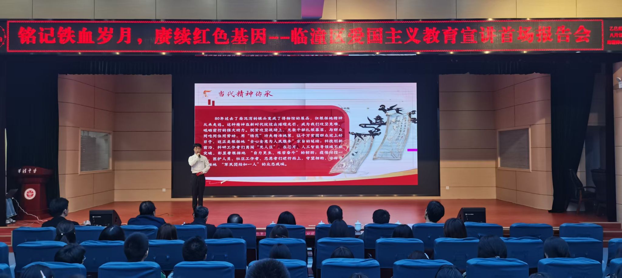 铭记铁血岁月,赓续红色基因。10月17日,临潼区教育局面向全区中学开展爱国主义教育,m88 app红言宣讲团受邀走进华清中学,正式拉开首场主题宣讲帷幕。临潼区教育局党委委员赵小县,教育科干部黄玉仁;华清中学校长李东京,党委副书记张哲,高一师生代表400余人参加活动;我校党委学工部副部长、学生处副处长薛建航,教务处副处长兼招生办公室主任李鹏,“红言宣讲团”指导教师李超参加活动。此次宣讲是我校精准对接地方基础教育需求,服务地方教育发展,搭建校地协同育人桥梁的一次重要实践。