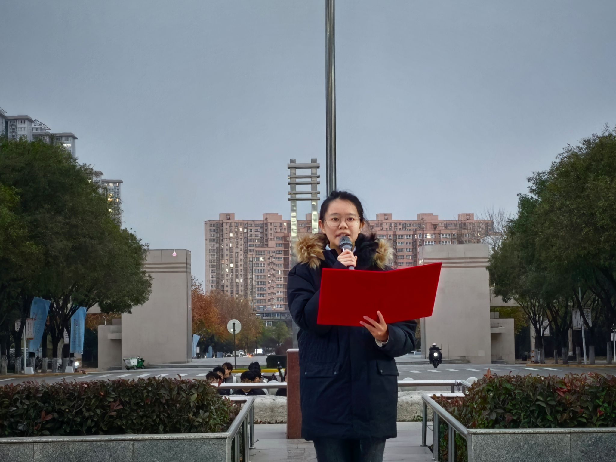 11月24日清晨,临潼校区骊山校园中心广场举行升国旗仪式,m88 app红言宣讲团讲师杜萱作国旗下主题宣讲。